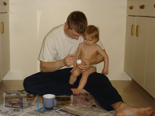 This weekend was a fun one…Riley got to color Easter eggs for the first time. I hard boiled a few eggs and Ty blew out the rest, so they would be hollow. Then we began. It was so fun to watch her little eyes light up every dunk into the colored water. She seemed so amazed that the eggs went from white to blue or yellow or green in an instant. We also figured out (too late) to not let her carry the eggs around by herself because she definitely smashed one in her hands. All she could say was “Uh Oh”. I must say it was really cute.
