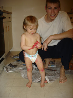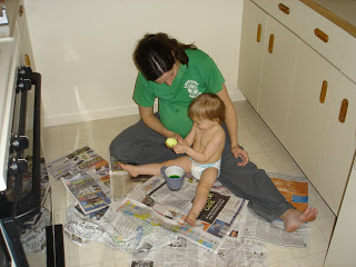 Even though we had a blast, she made a mess!!! It was definitely a good thing we put lots of newspaper down and got her naked, down to her diaper. It was straight to the bathtub when she was finished–she kept wanting to touch things and I was so paranoid she’d get coloring on everything she touched. Although daddy scrubbed and scrubbed, the bath didn’t help much because today (two days later) her hands are still a BRIGHT pink.
