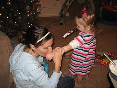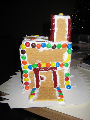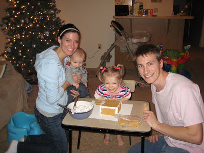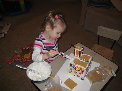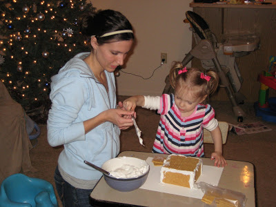 We’ve also continued the tradition that my mom started when we were little, making homemade gingerbread houses. Ty and I have done it since we’ve been married and have also done it since Riley was born. This year was Lincoln’s first time, but he slept through most of it. Riley had a blast making the gingerbread houses, although I’m pretty sure that she enjoyed eating the candy more than anything. We use graham crackers and homemade frosting (a recipe given to me by my mom, who was given the same recipe from her great-grandmother) We also had licorice, m and m’s, candy corn, etc. The only time she normally gets candy is when she goes potty on her potty seat, so tonight was a treat!!