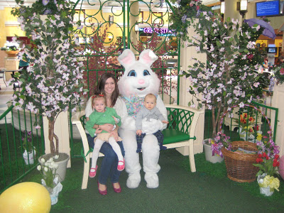 I took the kids to the mall to visit the Easter Bunny this week and Riley wasn’t thrilled, hench the reason I am in the picture with them. She wouldn’t let go of the death grip she had on my neck when I tried to put her on the Bunny’s lap! Lincoln, on the otherhand, couldn’t have cared less. What an easy going baby!