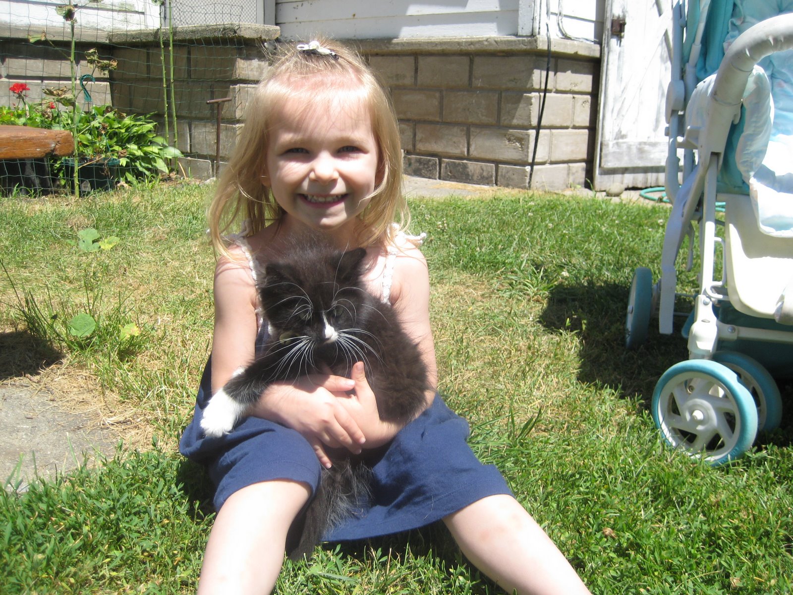 A while ago Ri was deathly afraid of the animals, but lately she LOVES them. Almost to the point where I have to tell her to leave them alone. She was petting the dogs then she found this poor kitten. I say “poor” because I felt bad for the thing. Riley wouldn’t leave it alone! She carried “Boots” around everywhere she went, even carrying it around in Grandma’s old stroller! I couldn’t believe how much she enjoyed playing on the farm! I’m glad they’ve got animals because we never will!!