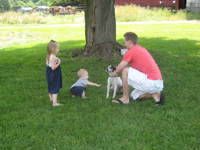 About a week ago we went down to visit Ty’s family on the farm and Riley, to say the least, was THRILLED. She kept saying “Riley see Grandma on the farm” (that’s how she distinguishes which Grandma we’re talking about) and “Riley see am-in-als”. She was sleeping when we pulled in, but it’s like she knew we were at the farm and she woke up ready to get dirty!! We also got to see Ty’s Grandma, Mom, sister and Dad. We hung out with them the whole day. It’s great to be outside and just let the kids run free. (Man, how I wish we had a backyard) Lincoln wasn’t a happy camper most of the afternoon, but after his nap he perked up and had fun too. Ty’s Grandma said Lincoln wasn’t himself and I completely agreed! He cried for what seemed like hours! He wasn’t as thrilled to see the animals as Riley was although, he didn’t really mind either.