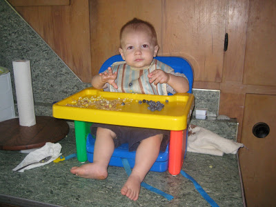 Lincoln eating lunch on the counter. The booster doesn’t fit very well on their seat, so we improvise! Blueberries and leftovers from home.