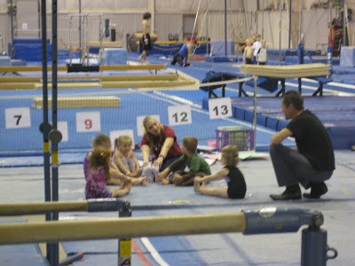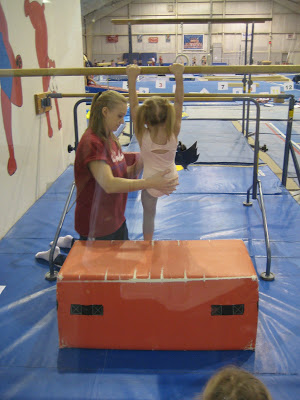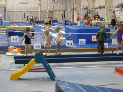 Riley had her first gymnastics class on Monday and she loved it–okay, not at first, but once she got warmed up she loved it! She was so excited when their group got called to run into the gym with her bud Nolan, but once she realized that I was on the other side of the glass she wasn’t‘ the least bit thrilled. The kids were warming up and Riley was in the arms of her teacher, crying, telling her “I want Mommy”. The poor teacher carried her around like that for a good 5-10 minutes. I tried to hide in the other room so she couldn’t see me and she finally calmed down enough to participate! They stretched, did bars, the balance beam, the trampoline, obstacle courses, and other things. I think Riley’s favorite was the trampoline.