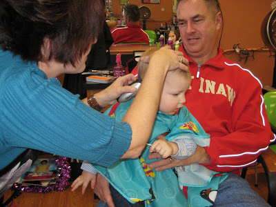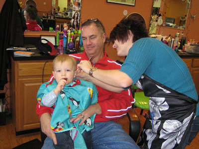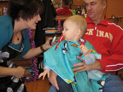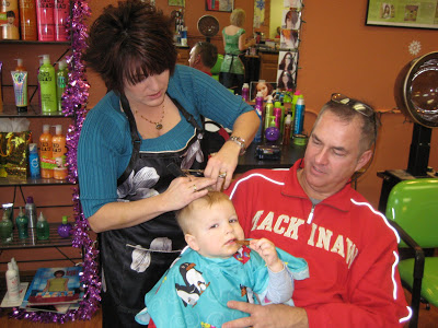 Lincoln finally got his first official haircut while we were back in MI. His mullet just had to go, we were fitting in, in West Virgina too well :). He didn’t have much hair to cut, especially on top, but it still needed to be trimmed. I had trimmed it previously but my cut just wasn’t working for him. So on Saturday (1/2/10) my Dad, “Papa”, and I took Lincoln to get his haircut in Bridgman where my little sisters go. It was right in the middle of nap time, I know, not the best timing, but that’s the appointment that they had so I wasn’t sure how Lincoln would do. Thankfully my dad walked next door to Ben Franklin and picked up a sucker to keep him occupied while! Dad picked a Slow Poke, the messiest, stickiest sucker out there and by the time she was done the sucker had hair and slobber covering it, but it did keep him occupied and he didn’t seem to mind :). He was great, the only time he was a little nervous was when she turned on the electric clippers. Papa was proud to have him on his lap and I was glad so I could snap some pictures!