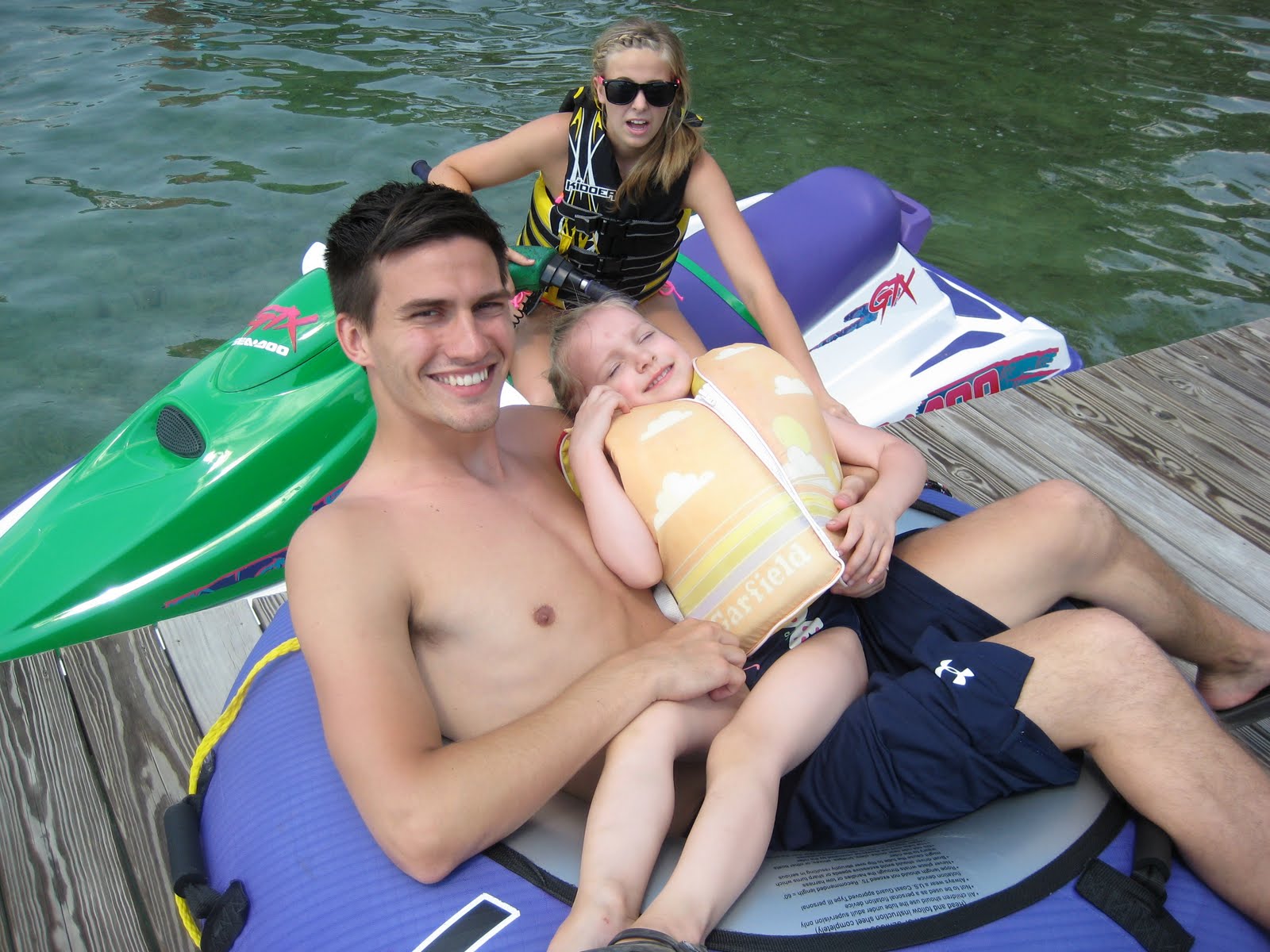 We left my Dad’s after church on Sunday morning and headed up to my mom’s. We love going there because we love hanging out on the lake all day. This summer was Lincoln’s first time on the boat and he loved every second of it. Riley loves riding on the boat too, but she must have been tired because she fell asleep on Kolby’s lap the first time she went out. I decided to give riding the boat a try, but we had to turn around pretty quickly because baby couldn’t handle the waves…thankfully Kolby and Britton were there and were able to hold the kids while I sat on the dock and Ty was riding the jet-ski.
