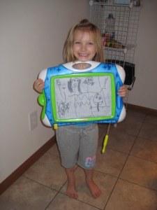 The ONE thing that can keep Riley occupied and sitting for longer than 2 seconds is drawing/coloring. I have a feeling she is going to be our artist. (Actually Ty is really good at drawing too). Anyways…she asked what she should draw one moring and I told her our family. Not expecting much in return, I was pleasantly surprised when she came out of the kitchen having drawn this picture: