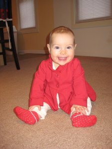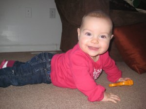 She cruises now while crawling and even though she loves to roam she still prefers me to hold her. I always know when she wants up because she crawls over to me and “headbuts” me in the shins π