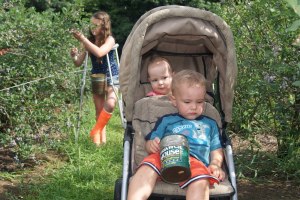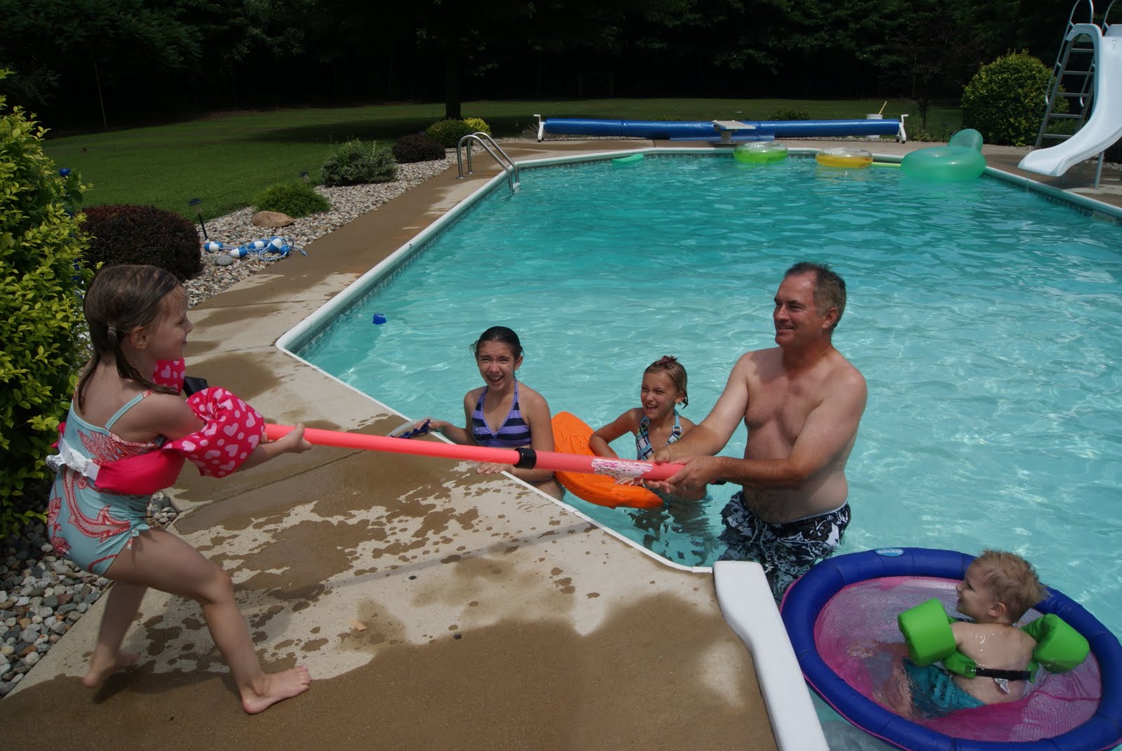 After blueberry picking we went to a friend’s pool and spent the whole afternoon swimming and going down the slide. Riley has never gone down a water slide before but, of course, even before she got in the water she ran right to the slide and went down it. I’m telling you, that girl of mine is fearless. Lincoln on the other hand opted out of going down the slide. He was much more content float in the shallow end!
