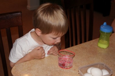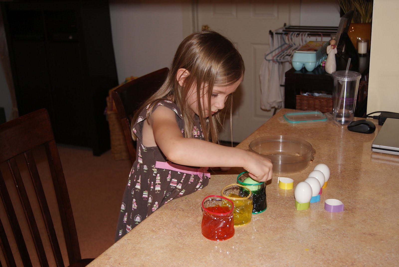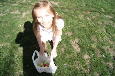 This year we spent Easter at home and didn’t travel anywhere. Instead we had a get together at our house, after church, with a bunch of friends (Newton’s, Koons’ and Kammin’s. They also happen to be neighbors!). After our get together we had an Easter egg hunt for the kids and we dyed easter eggs as well. The kids really enjoyed the egg hunt. Everytime Emmersyn would find an egg, she’d plop down on her bottom, open the egg and eat the candy. I kept trying to get her to put it in a bag, but it was hopeless.