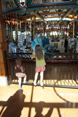 E hates carousels. I’m not sure why I even bothered trying to get her to ride. I ended up sitting on one of the non-moving benches with her laying her head on my lap until it was over. She’s not a fan (and never has been). Lincoln rode what he kept calling the mosquito, but it was actually a prey mantis :).